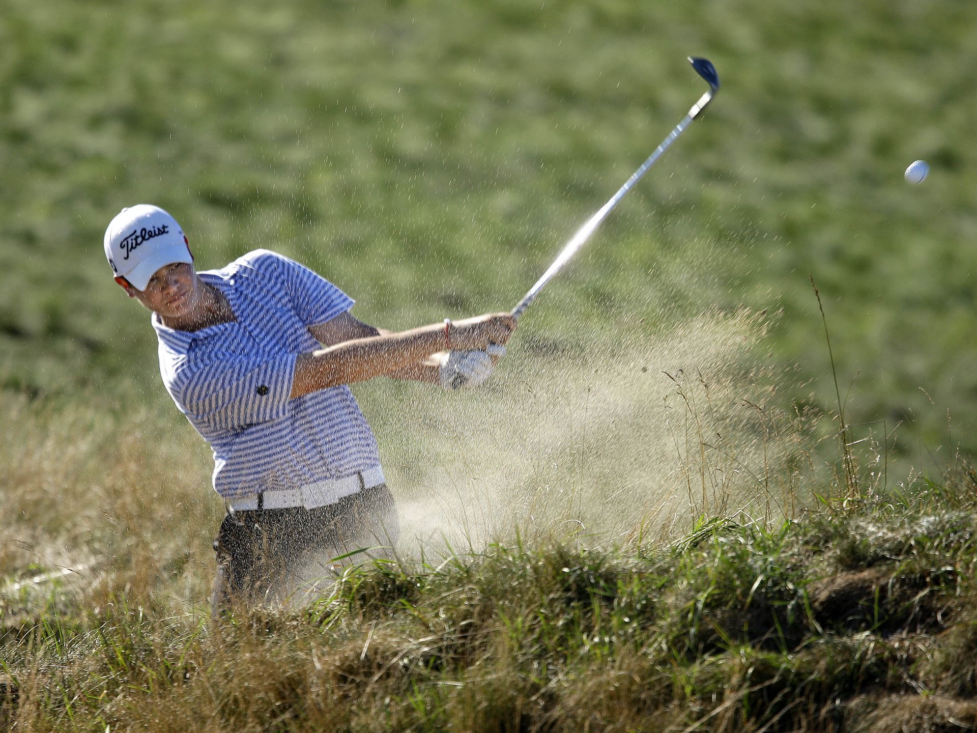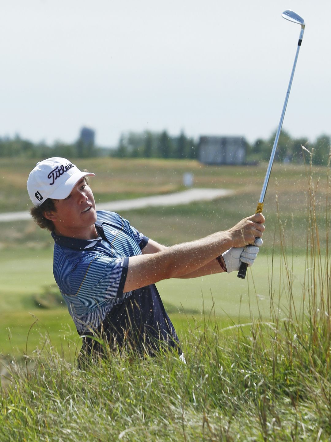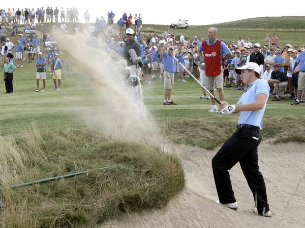 fairway bunker at the 2011 U.S. Amateur at Erin Hills. Kelly Kraft hits out of