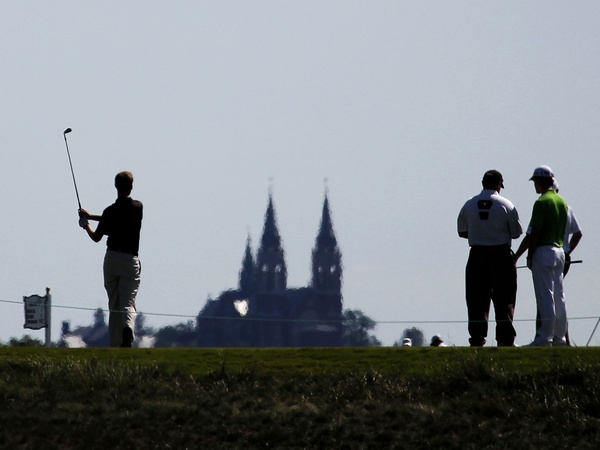 the course and Lang's dream ended. Golfers are silhouetted on